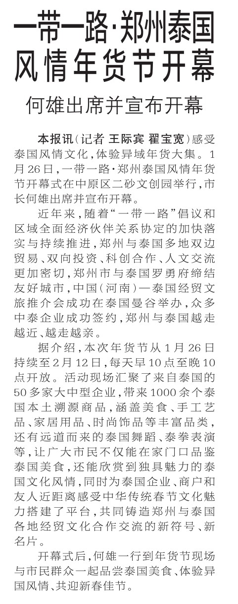 感受泰国风情文化,体验异域年货大集。1月26日,一带一路·郑州泰国风情年货节开幕式在中原区二砂文创园举行,市长何雄出席并宣布开幕。(今日《郑州日报》1版)