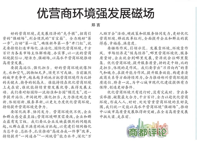 好的营商环境,是发展经济的“先手棋”,招商引资的“强磁场”,利企便民的“百宝箱”。全力跑好“第一步”,打好“第一仗”,确保新年第一季“开门红”,就是要持续打造市场化、法治化、国际化营商环境,千方百计为各类市场主体解难题、办实事,以一流的营商环境提信心、增活力、强磁场,以高水平营商环境推动高质量发展。(今日《郑州日报》2版)