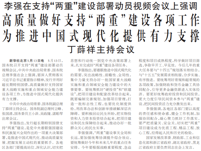 5月13日,国务院召开支持“两重”建设部署动员视频会议,中共中央政治局常委、国务院总理李强在会上强调,要深入贯彻落实习近平总书记重要指示精神,发行并用好超长期特别国债,高质量做好支持国家重大战略实施和重点领域安全能力建设各项工作,为推进中国式现代化提供有力支撑。(今日《人民日报》1版)