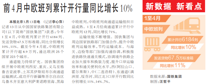 前4月中欧班列累计开行量同比增长10%