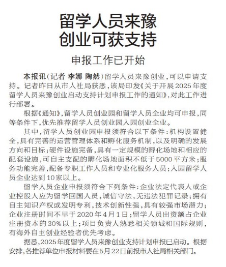 留学人员来豫创业,可以申请支持。记者昨日从市人社局获悉,该局印发《关于开展2025年度留学人员来豫创业启动支持计划申报工作的通知》,对此工作进行部署。(今日《郑州日报》1版)