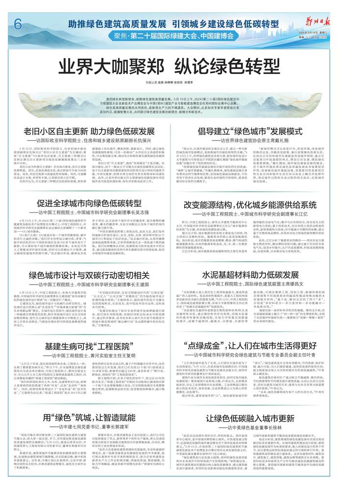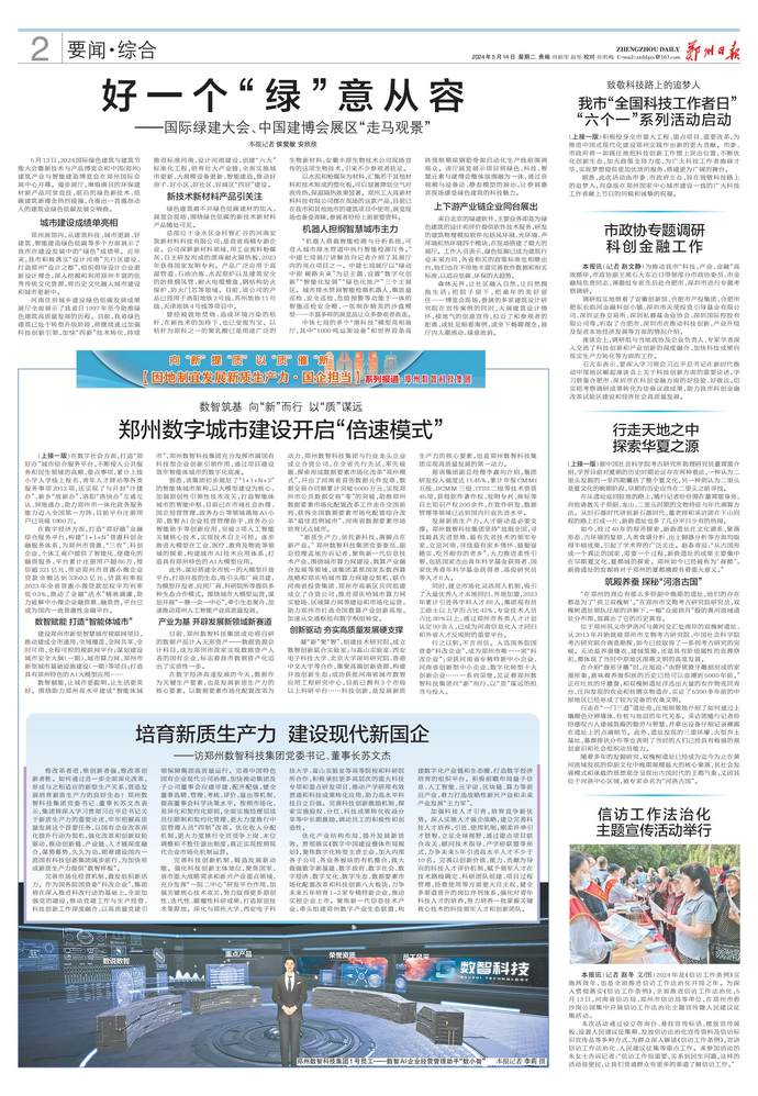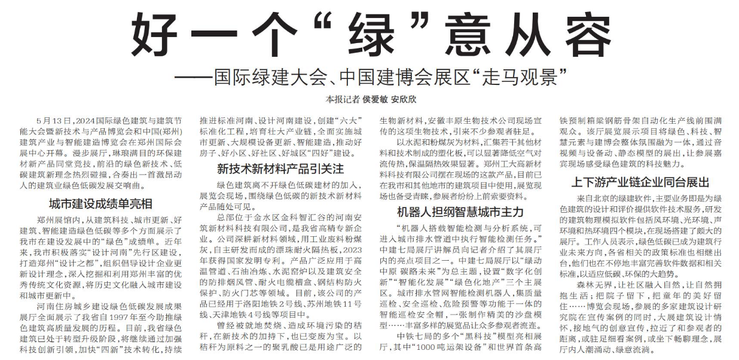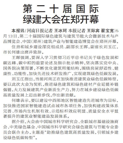 5月13日,第二十届国际绿色建筑与建筑节能大会暨新技术与产品博览会、中国(郑州)建筑产业与智能建造博览会在郑州开幕。(今日《郑州日报》1版)