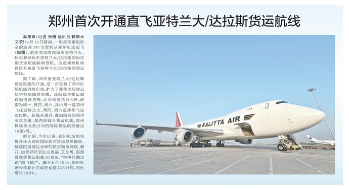 5月13日清晨,一架美国康尼航空的波音747全货机从郑州机场起飞,前往美国南部城市亚特兰大,标志着郑州至亚特兰大/达拉斯国际定期货运航线顺利首航。这是郑州机场首次开通直飞亚特兰大/达拉斯的货运航线。(今日《郑州日报》1版)