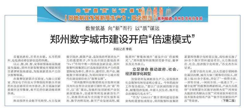 以云、数、网、智、安等新型基础设施建设为基础,郑州市新型智慧城市视联网项目紧锣密鼓地建设,为发展新质生产力夯实数智根基。(今日《郑州日报》1版、2版)
