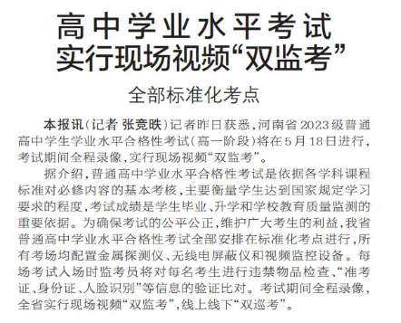 记者昨日获悉,河南省2023级普通高中学生学业水平合格性考试(高一阶段)将在5月18日进行,考试期间全程录像,实行现场视频“双监考”。(今日《郑州日报》1版)
