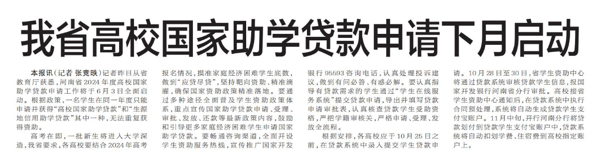 记者昨日从省教育厅获悉,河南省2024年度高校国家助学贷款申请工作将于6月3日全面启动。根据政策,一名学生在同一年度只能申请并获得“高校国家助学贷款”和“生源地信用助学贷款”其中一种,无法重复获得资助。(今日《郑州日报》5版)