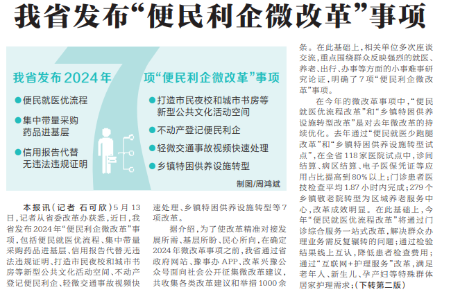 5月13日,记者从省委改革办获悉,近日,我省发布2024年“便民利企微改革”事项,包括便民就医优流程、集中带量采购药品进基层、信用报告代替无违法违规证明、打造市民夜校和城市书房等新型公共文化活动空间、不动产登记便民利企、轻微交通事故视频快速处理、乡镇特困供养设施转型等7项改革。(今日《河南日报》1版、2版)