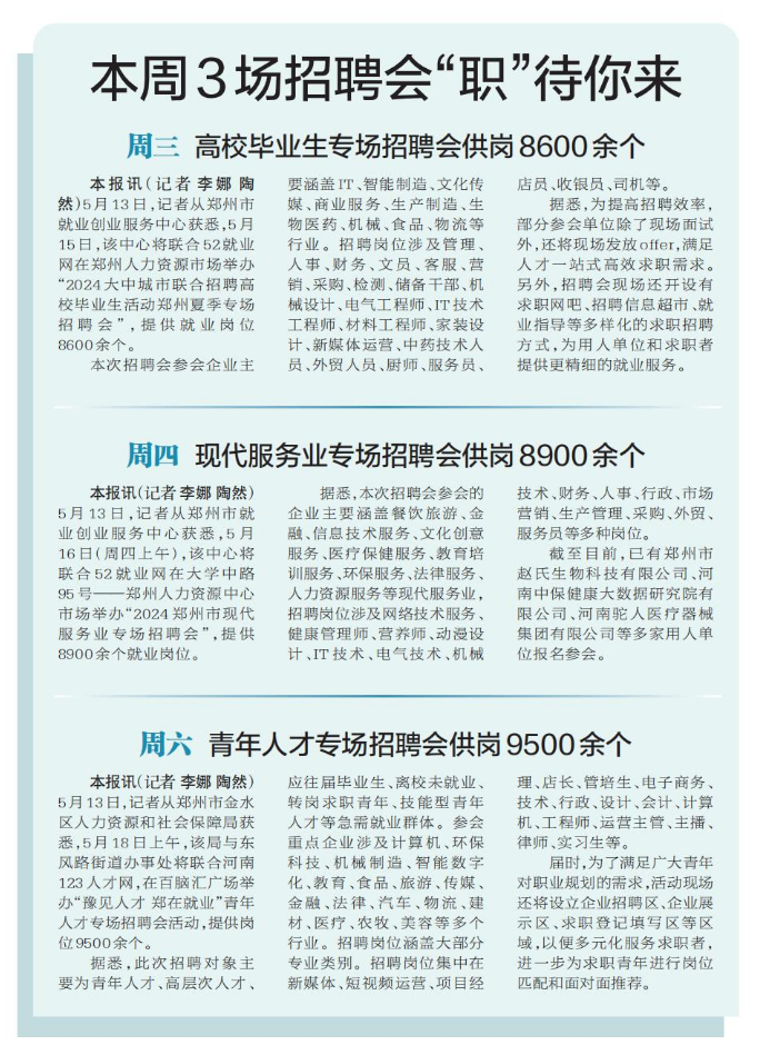 5月13日,记者从郑州市就业创业服务中心获悉,5月15日,该中心将联合52就业网在郑州人力资源市场举办“2024大中城市联合招聘高校毕业生活动郑州夏季专场招聘会”,提供就业岗位8600余个。(今日《郑州日报》5版)