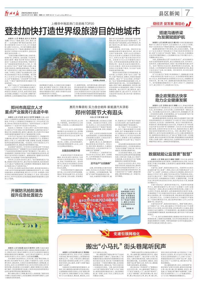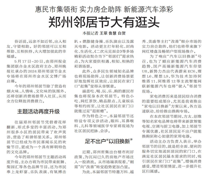 5月17日~20日,由郑州报业集团联合金水区政府主办,郑州晚报社承办的2024郑州邻居节金水专场将在郑州市金水区文博广场启幕。(今日《郑州日报》7版)