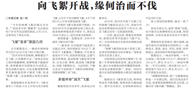 “今年的杨柳飞絮好像比往年多。”“困扰多年的‘飘絮季’无法根治吗?”针对市民近期的困扰,5月13日,记者采访了相关专家。(今日《河南日报》2版)