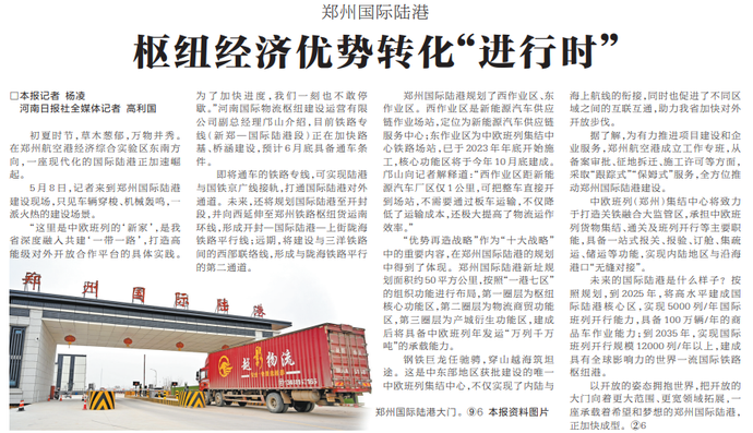 初夏时节,草木葱郁,万物并秀。在郑州航空港经济综合实验区东南方向,一座现代化的国际陆港正加速崛起。(今日《河南日报》3版)