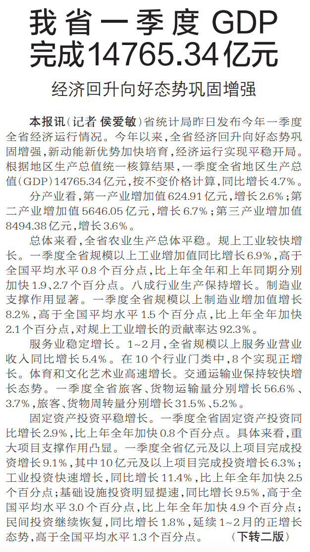 我省一季度GDP完成14765.34亿元