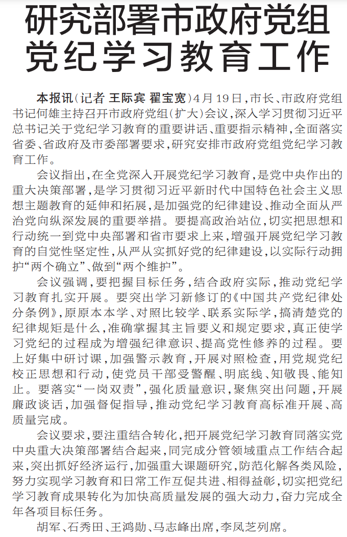 4月19日,市长、市政府党组书记何雄主持召开市政府党组(扩大)会议,深入学习贯彻习近平总书记关于党纪学习教育的重要讲话、重要指示精神,全面落实省委、省政府及市委部署要求,研究安排市政府党组党纪学习教育工作。(今日《郑州日报》1版)