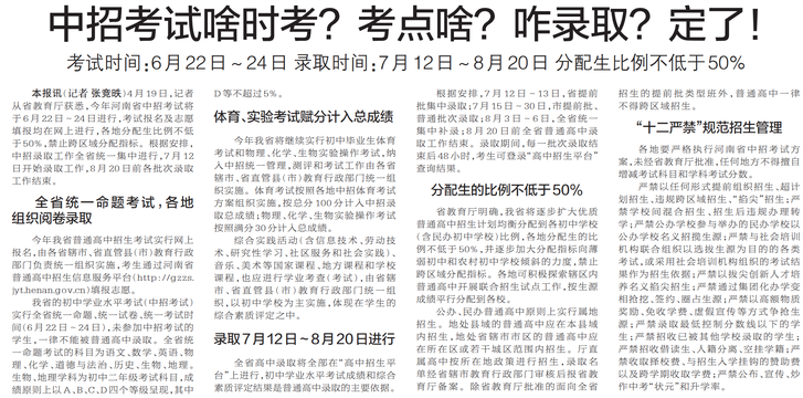 4月19日,记者从省教育厅获悉,今年河南省中招考试将于6月22日~24日进行,考试报名及志愿填报均在网上进行,各地分配生比例不低于50%,禁止跨区域分配指标。根据安排,中招录取工作全省统一集中进行,7月12日开始录取工作,8月20日前各批次录取工作结束。(今日《郑州日报》2版)