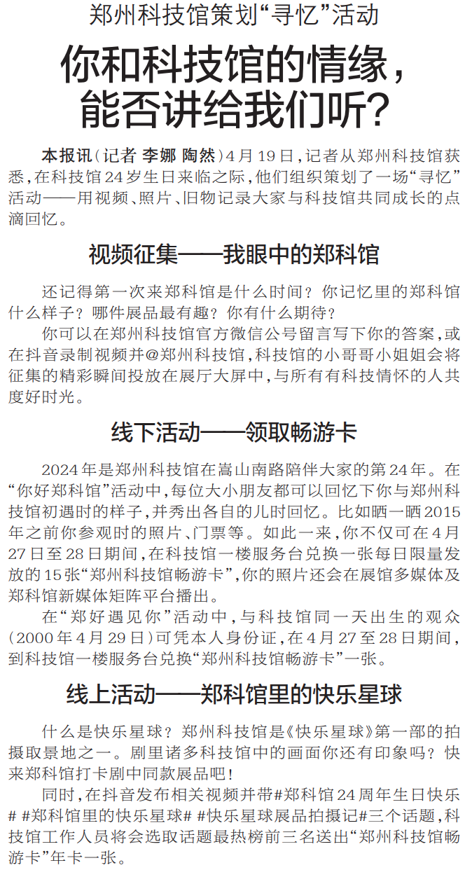 4月19日,记者从郑州科技馆获悉,在科技馆24岁生日来临之际,他们组织策划了一场“寻忆”活动——用视频、照片、旧物记录大家与科技馆共同成长的点滴回忆。(今日《郑州日报》2版)