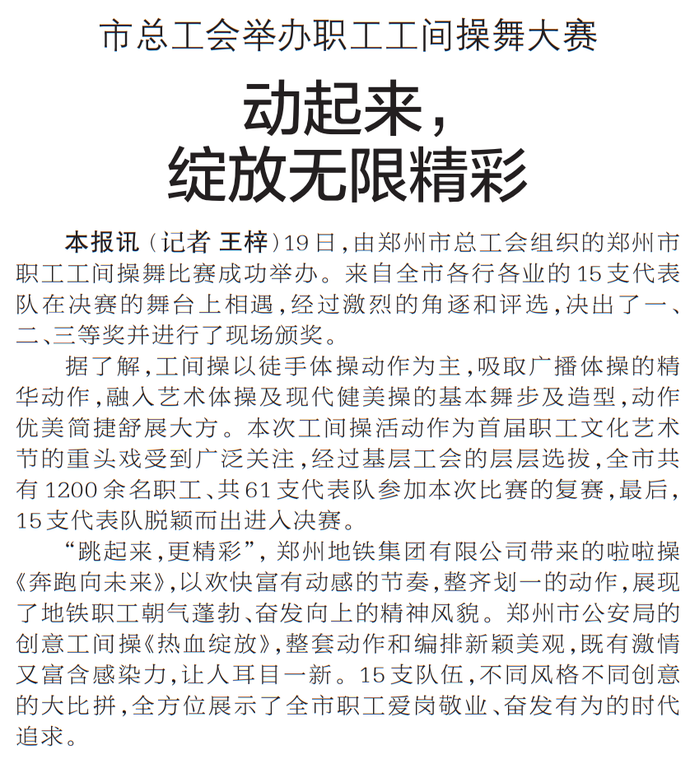 19日,由郑州市总工会组织的郑州市职工工间操舞比赛成功举办。来自全市各行各业的15支代表队在决赛的舞台上相遇,经过激烈的角逐和评选,决出了一、二、三等奖并进行了现场颁奖。(今日《郑州日报》2版)