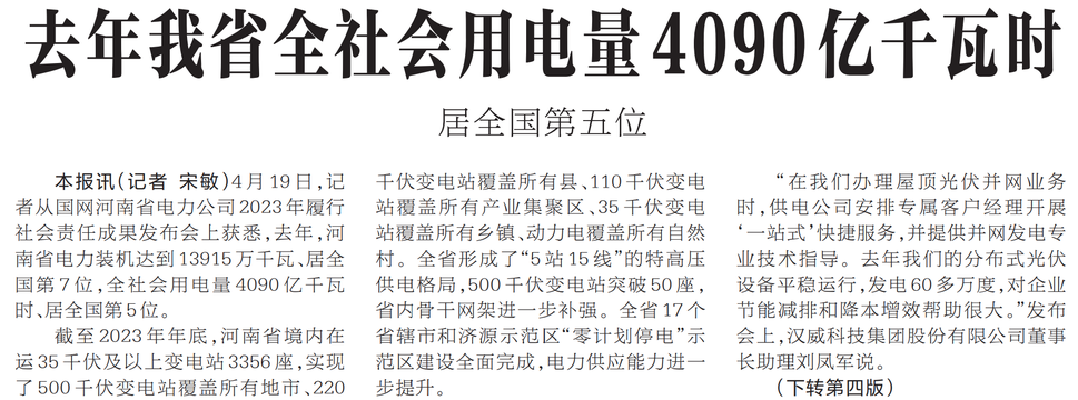 4月19日,记者从国网河南省电力公司2023年履行社会责任成果发布会上获悉,去年,河南省电力装机达到13915万千瓦、居全国第7位,全社会用电量4090亿千瓦时、居全国第5位。(今日《河南日报》1版、4版)