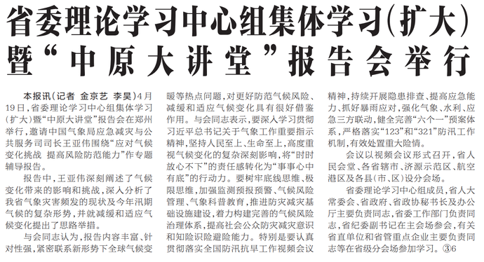 4月19日,省委理论学习中心组集体学习(扩大)暨“中原大讲堂”报告会在郑州举行,邀请中国气象局应急减灾与公共服务司司长王亚伟围绕“应对气候变化挑战 提高风险防范能力”作专题辅导报告。(今日《河南日报》1版)