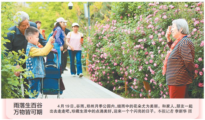 4月19日,谷雨,郑州月季公园内,细雨中的花朵尤为美丽。和家人、朋友一起出去走走吧,珍藏生活中的点滴美好,迎来一个个闪亮的日子。(今日《郑州日报》1版)