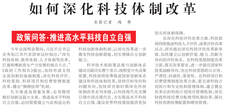 今年全国两会期间,习近平总书记在参加江苏代表团审议时指出:“深化科技体制、教育体制、人才体制等改革,打通束缚新质生产力发展的堵点卡点。”《政府工作报告》提出,加快形成支持全面创新的基础制度,深化科技评价、科技奖励、科研项目和经费管理制度改革,健全“揭榜挂帅”机制。(今日《人民日报》1版)