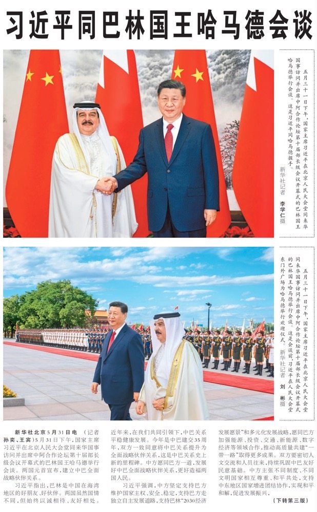 5月31日下午,国家主席习近平在北京人民大会堂同来华国事访问并出席中阿合作论坛第十届部长级会议开幕式的巴林国王哈马德举行会谈。两国元首宣布,建立中巴全面战略伙伴关系。(今日《人民日报》1版、3版)