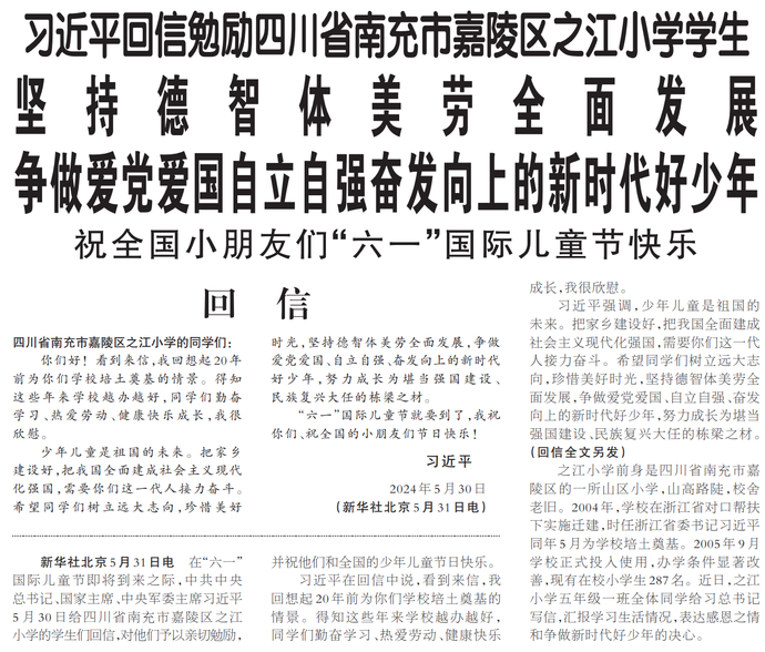 在“六一”国际儿童节即将到来之际,中共中央总书记、国家主席、中央军委主席习近平5月30日给四川省南充市嘉陵区之江小学的学生们回信,对他们予以亲切勉励,并祝他们和全国的少年儿童节日快乐。(今日《人民日报》1版)