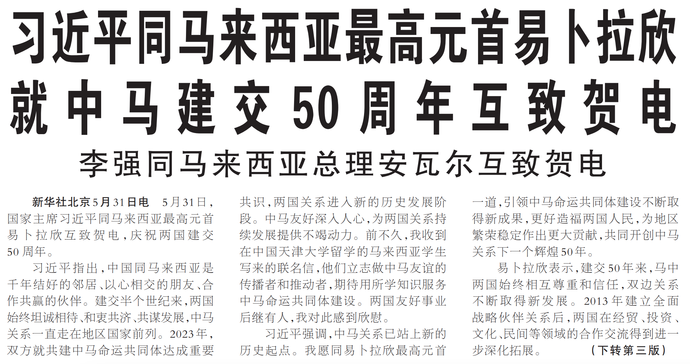 5月31日,国家主席习近平同马来西亚最高元首易卜拉欣互致贺电,庆祝两国建交50周年。(今日《人民日报》1版、3版)
