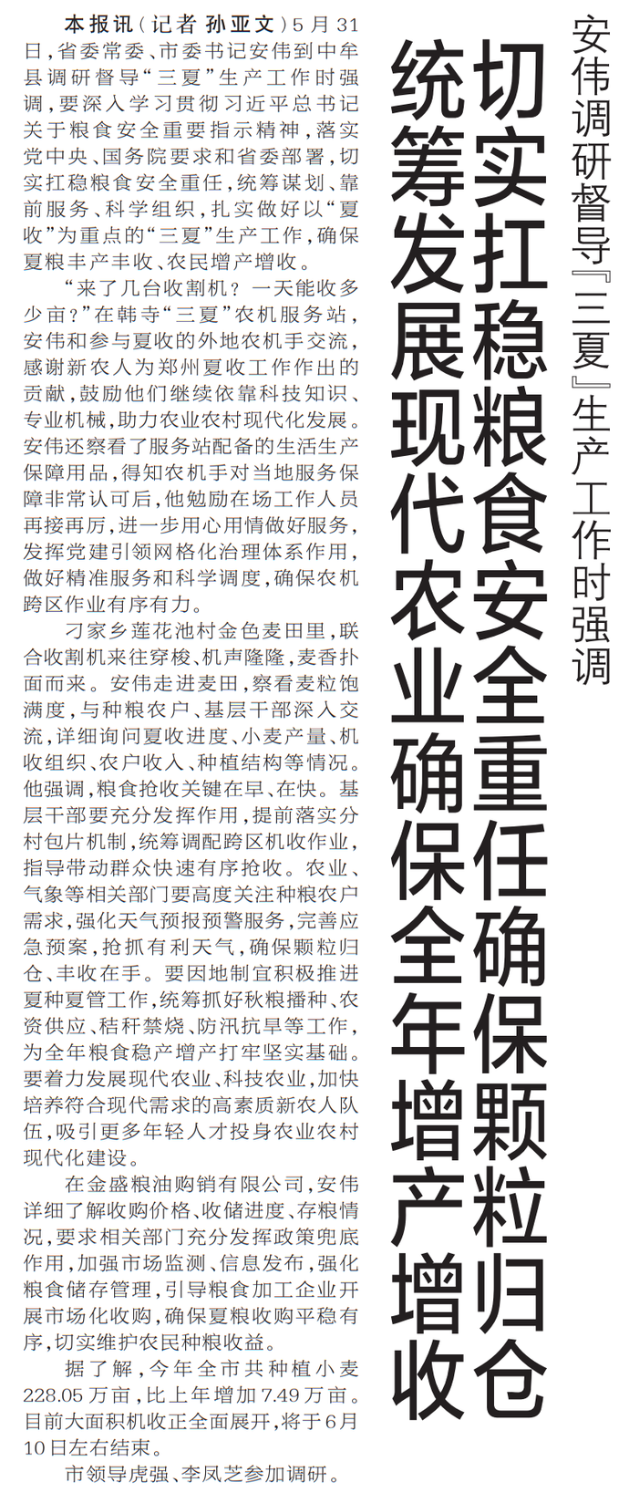 5月31日,省委常委、市委书记安伟到中牟县调研督导“三夏”生产工作时强调,要深入学习贯彻习近平总书记关于粮食安全重要指示精神,落实党中央、国务院要求和省委部署,切实扛稳粮食安全重任,统筹谋划、靠前服务、科学组织,扎实做好以“夏收”为重点的“三夏”生产工作,确保夏粮丰产丰收、农民增产增收。(今日《郑州日报》1版)