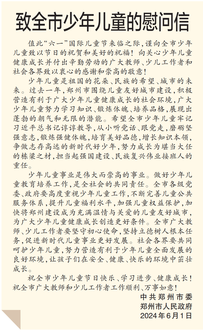 值此“六一”国际儿童节来临之际,谨向全市少年儿童致以节日的祝贺和美好的祝福!向关心少年儿童健康成长并付出辛勤劳动的广大教师、少儿工作者和社会各界致以衷心的感谢和崇高的敬意!(今日《郑州日报》1版)