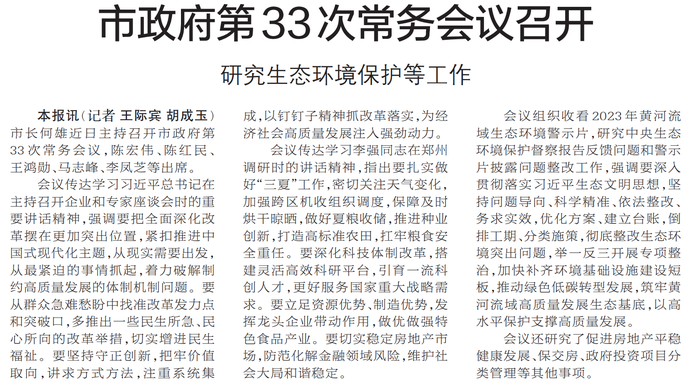 市长何雄近日主持召开市政府第33次常务会议,陈宏伟、陈红民、王鸿勋、马志峰、李凤芝等出席。(今日《郑州日报》1版)