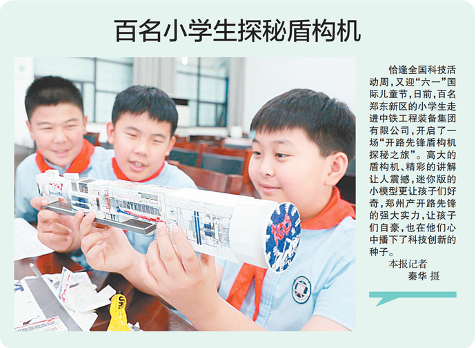 恰逢全国科技活动周,又迎“六一”国际儿童节,日前,百名郑东新区的小学生走进中铁工程装备集团有限公司,开启了一场“开路先锋盾构机探秘之旅”。高大的盾构机、精彩的讲解让人震撼,迷你版的小模型更让孩子们好奇,郑州产开路先锋的强大实力,让孩子们自豪,也在他们心中播下了科技创新的种子。(今日《郑州日报》1版)