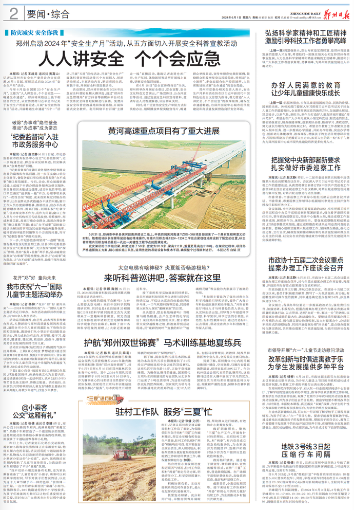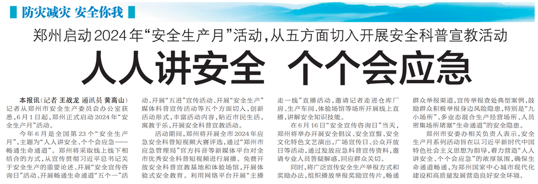 记者从郑州市安全生产委员会办公室获悉,6月1日起,郑州正式启动2024年“安全生产月”活动。(今日《郑州日报》2版)
