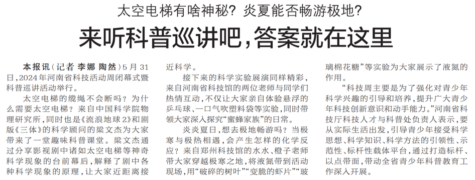 5月31日,2024年河南省科技活动周闭幕式暨科普巡讲活动举行。(今日《郑州日报》2版)