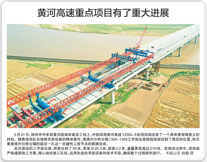 5月31日,郑州市中牟县黄河段南岸建设工地上,中铁四局黄河高速YZSG-3标项目部迎来了一个具有里程碑意义的时刻。随着现场队长指挥吊装设备的精准操作,南堤内引桥左幅132#-133#工字组合梁稳稳地架设到了预定的位置,标志着南堤内引桥左幅的最后一孔这一关键性工程节点的圆满完成。(今日《郑州日报》2版)