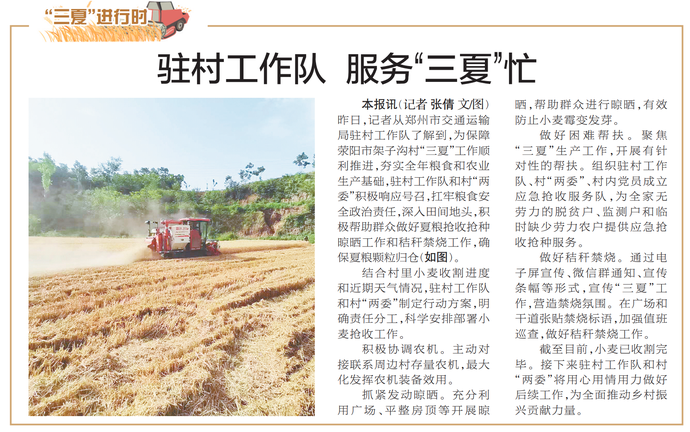 昨日,记者从郑州市交通运输局驻村工作队了解到,为保障荥阳市架子沟村“三夏”工作顺利推进,夯实全年粮食和农业生产基础,驻村工作队和村“两委”积极响应号召,扛牢粮食安全政治责任,深入田间地头,积极帮助群众做好夏粮抢收抢种晾晒工作和秸秆禁烧工作,确保夏粮颗粒归仓。(今日《郑州日报》2版)