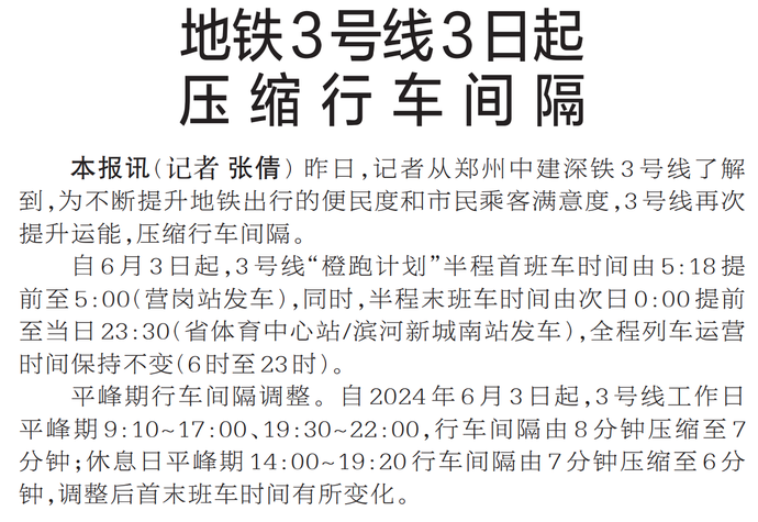 昨日,记者从郑州中建深铁3号线了解到,为不断提升地铁出行的便民度和市民乘客满意度,3号线再次提升运能,压缩行车间隔。(今日《郑州日报》2版)