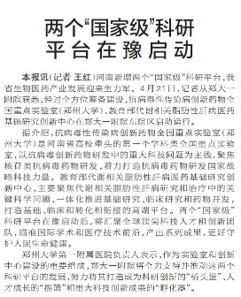 河南新增两个“国家级”科研平台,我省生物医药产业发展迎来生力军。4月21日,记者从郑大一附院获悉,经过全方位筹备建设,抗病毒性传染病创新药物全国重点实验室(郑州大学)、教育部代谢相关脂肪性肝病医药基础研究创新中心在郑大一附院东院区启动运行。(今日《郑州日报》1版)