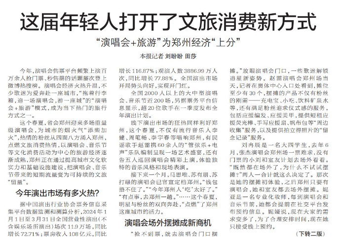 今年,演唱会售票平台频繁上演百万余人抢门票、秒售罄的话题屡次登上微博热搜榜。演唱会经济火热升温,不少歌迷为爱奔赴一座城市,“拖着行李箱,追一场演唱会,游一座城”的“演唱会+旅游”模式,成为当下热门的旅行方式之一。(今日《郑州日报》1版、2版)