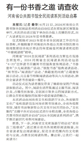 4月21日,2024河南省公共图书馆全民阅读系列活动启动仪式在郑东新区智慧岛举行,本次活动通过线下举办结合线上直播的形式,向广大读者发出2024年度书香邀请。(今日《郑州日报》1版)