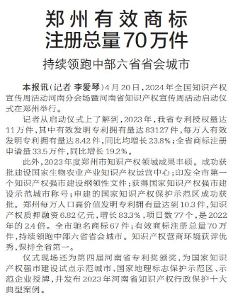 郑州有效商标注册总量70万件