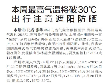 昨日,省气象台数据显示,郑州最高气温达25.8℃,市气象台气象预报显示,本周郑州市晴天一直“在线”,从周四开始,郑州连续3天最高气温将达30℃或以上,中午前后紫外线较强,市民出行注意防晒。此外,我省大部的森林火险气象等级将逐渐升高,需注意户外用火安全。若在野外发现涉山涉林起火冒烟情况,要及时拨打12119或119报警。(今日《郑州日报》1版)