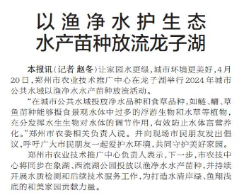 让家园水更绿,城市环境更美好,4月20日,郑州市农业技术推广中心在龙子湖举行2024年城市公共水域以渔净水水产苗种放流活动。(今日《郑州日报》1版)
