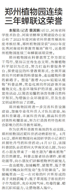 近日,河南省科学技术协会、河南省精神文明建设办公室公布了2023年度河南省科普教育基地年度考核结果,郑州植物园荣获“2023年度优秀河南省科普教育基地”称号,这是郑州植物园连续三年蝉联该项荣誉。(今日《郑州日报》2版)