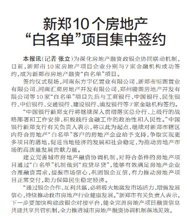 为深化房地产融资政银企协同联动机制,日前,新郑市10家房地产项目企业分别与7家金融机构成功签约,成为新郑市房地产融资“白名单”项目。(今日《郑州日报》5版)