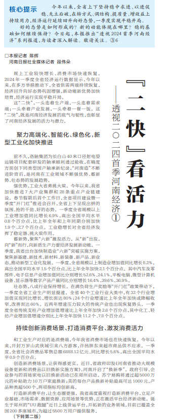 规上工业较快增长、消费市场快速恢复。2024年一季度全省经济运行数据显示,今年以来,在多方举措推动下,全省供需两端持续恢复,经济回升向好态势巩固增强,新动能新优势加快培育,经济运行实现平稳开局。(今日《河南日报》1版、2版)