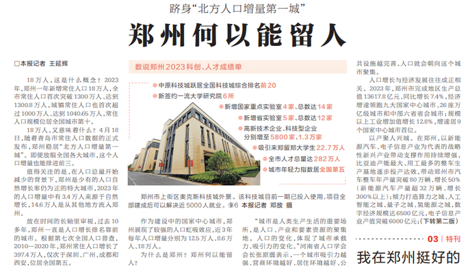 18万人,这是什么概念?2023年,郑州一年新增常住人口18万人,全市常住人口首次突破1300万人、达到1300.8万人,城镇常住人口也首次超过1000万人、达到1040.65万人,常住人口规模位居全国城市第十。(今日《河南日报》1版、2版)