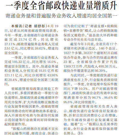 4月19日,记者从河南省邮政管理局获悉,今年一季度,全省邮政行业寄递业务量完成21.74亿件,同比增长37.11%;邮政普遍服务业务收入完成2.51亿元,同比增长26.62%,增速均居全国第一。(今日《河南日报》1版)