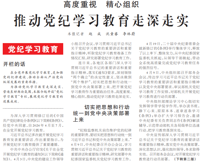 中共中央办公厅印发《关于在全党开展党纪学习教育的通知》(以下简称《通知》)。4月3日,中央党的建设工作领导小组召开会议,学习贯彻习近平总书记关于党纪学习教育的重要讲话和重要指示精神,听取党纪学习教育准备工作情况汇报,研究部署党纪学习教育工作。