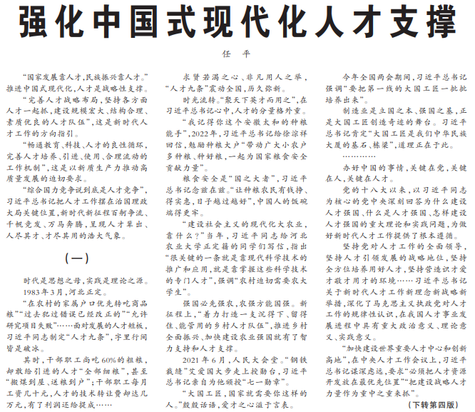 “国家发展靠人才,民族振兴靠人才。”推进中国式现代化,人才是战略性支撑。