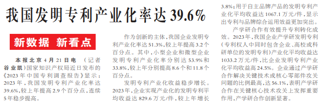 国家知识产权局近日发布的《2023年中国专利调查报告》显示:2023年,我国发明专利产业化率达39.6%,较上年提高2.9个百分点,连续5年稳步提高。(今日《人民日报》1版)